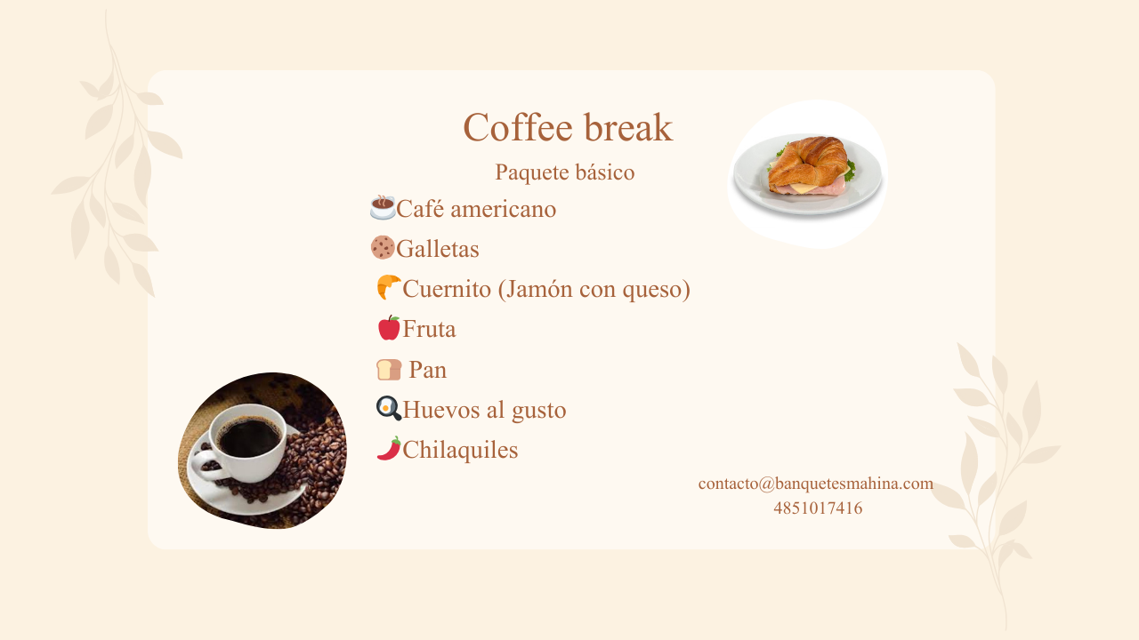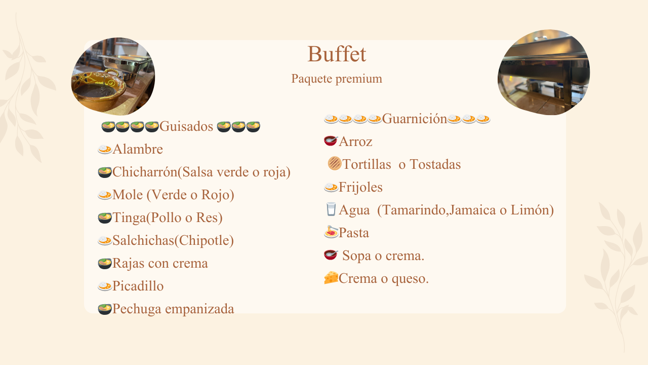 Elige entre nuestras opciones predefinidas de taquizas, buffet, menú infantil y coffee break. Cada paquete incluye los servicios básicos necesarios para tu evento.
