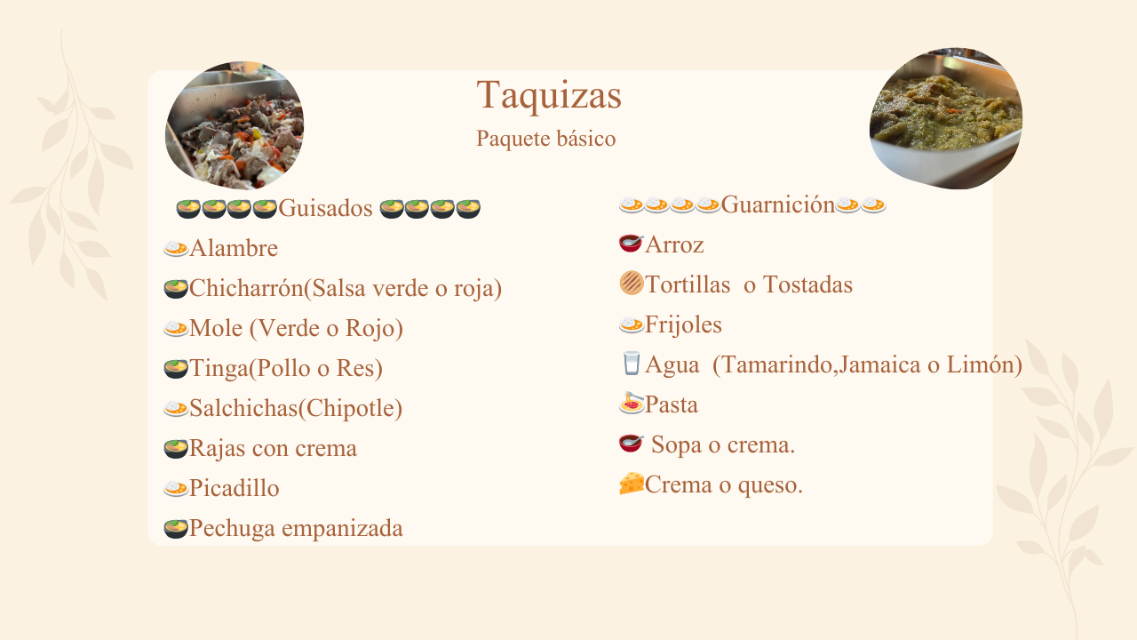 Somos una empresa ubicada en la Ciudad de México. Preparamos con cariño deliciosos paquetes de taquizas, buffet, coffee break y menú infantil, llevándolos hasta tu domicilio para que disfrutes sin preocupaciones